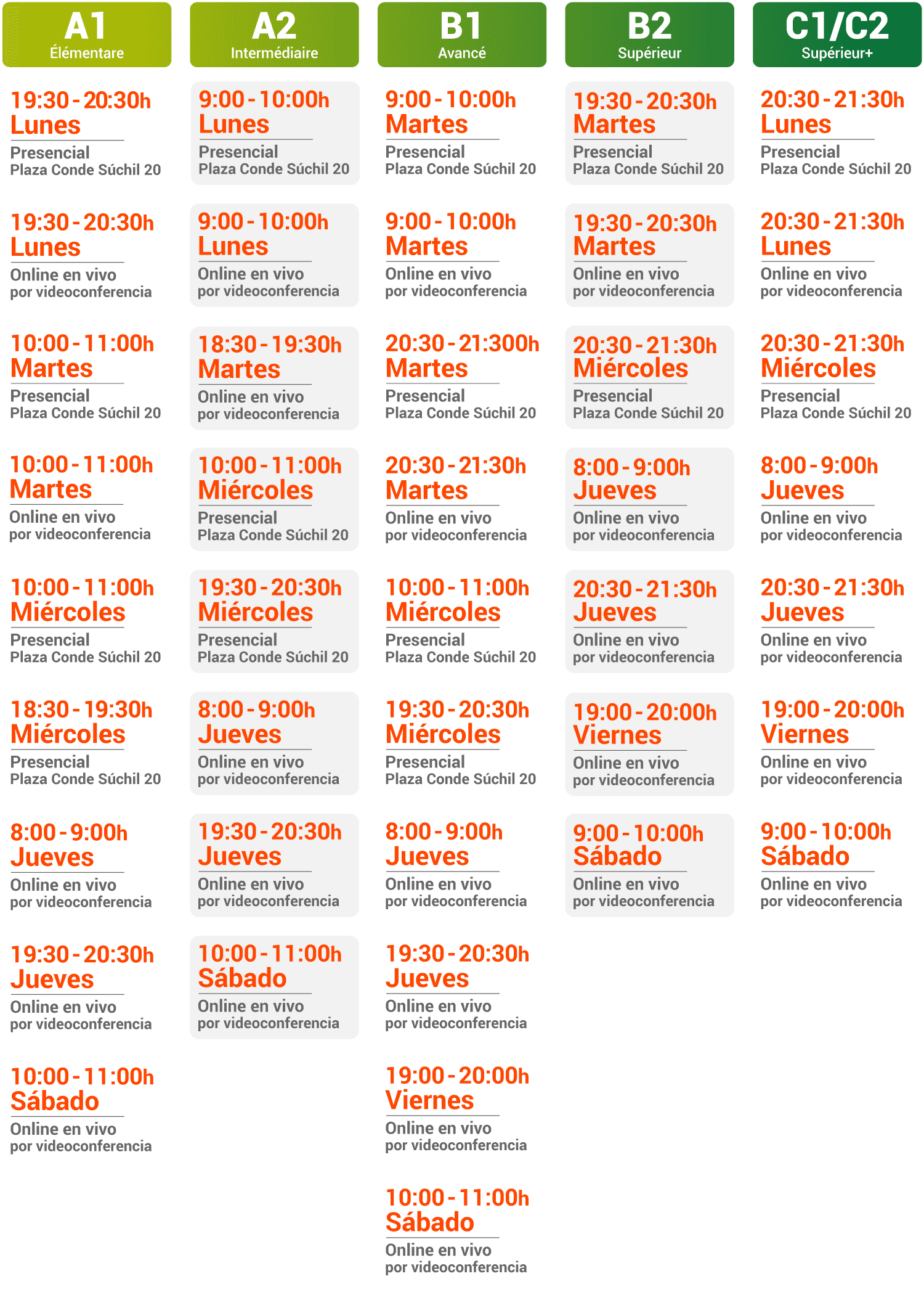 Todos los días de la semana. Asiste como y cuando quieras. Te recomendamos un mínimo de dos por semana + trabajo autónomo, así avanzarás un nivel cada cinco meses.