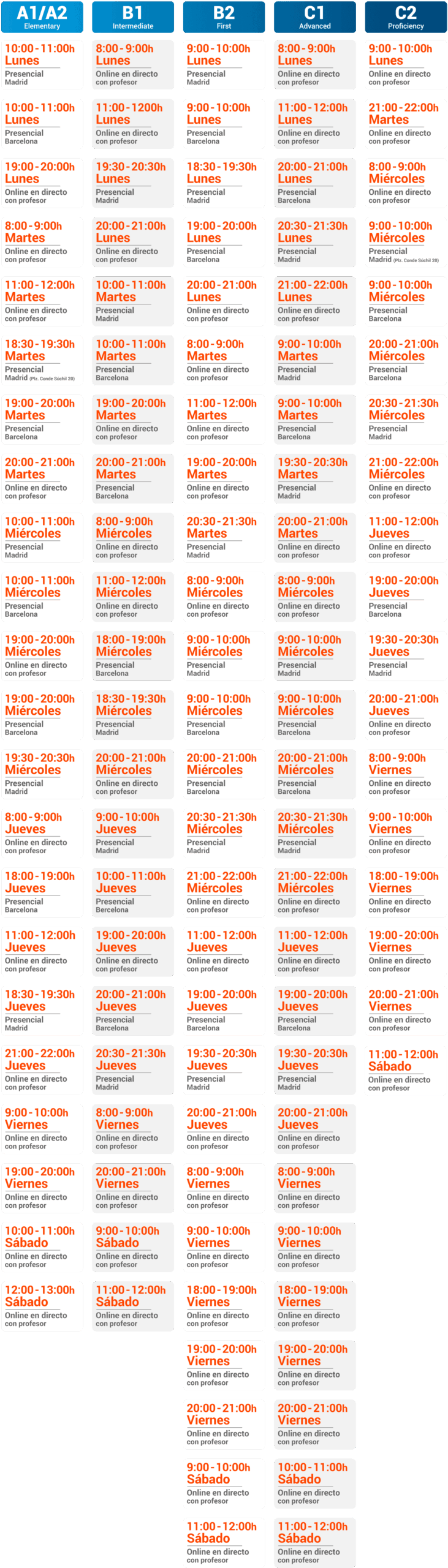 Todos los días de la semana. Asiste como y cuando quieras. Te recomendamos un mínimo de dos por semana + trabajo autónomo, así avanzarás un nivel cada cinco meses.