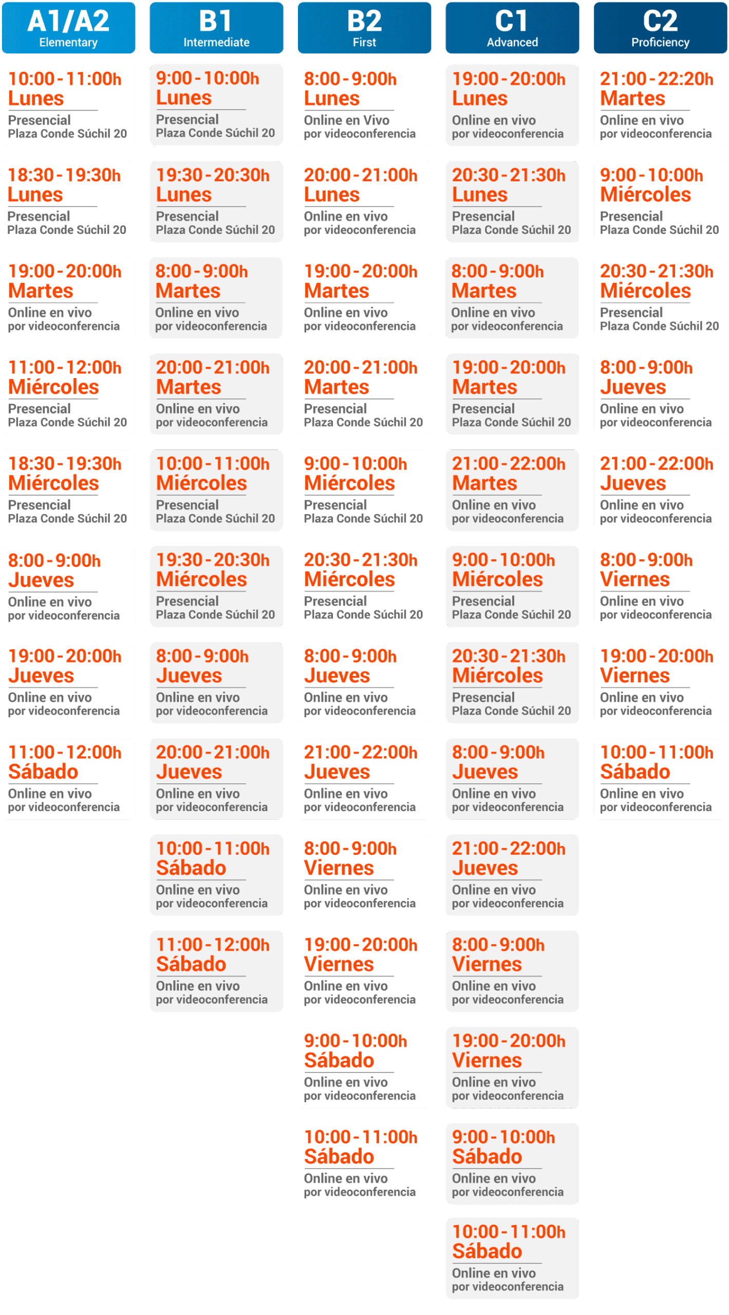Todos los días de la semana. Asiste como y cuando quieras. Te recomendamos un mínimo de dos por semana + trabajo autónomo, así avanzarás un nivel cada cinco meses.